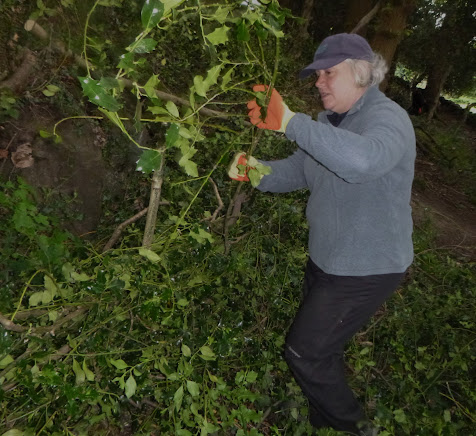 Once again the holly removal rules, mentioned in last week's blog, were followed. So, visualising baked bean tins, the volunteers sallied forth with their loppers, bow saws and bill hooks to clear more of the offending vegetation, and here they are in action.